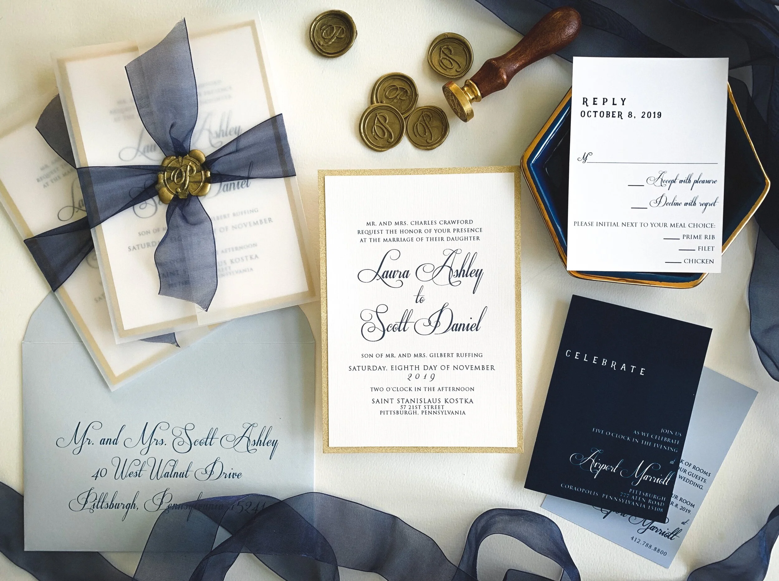 Our pocket suites are our most popular format and we can see why! Your formal invitation is layered onto a pocket with your additional cards held neatly together. Our pockets comes in a large variety of colors, shapes, papers and even laser cut designs.